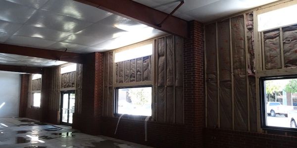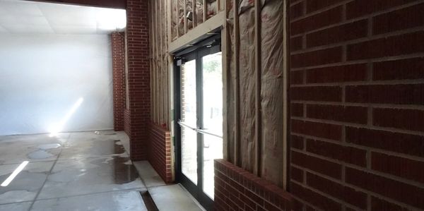 The brick laying on the front exterior wall began during the last few days of July. Framing for the restrooms, office and storage areas were also well underway. (Click on photos to see enlarged images.) Thanks to Bob Hawkins Trucking for transporting the bricks.