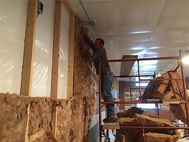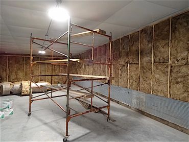 Below are photos from the December 12 workday as progress continued. Additional insulation was added to the exterior walls. With R35 insulation in the ceiling and R25 plus the additional added after initial construction in the walls, the building should be very energy efficient.